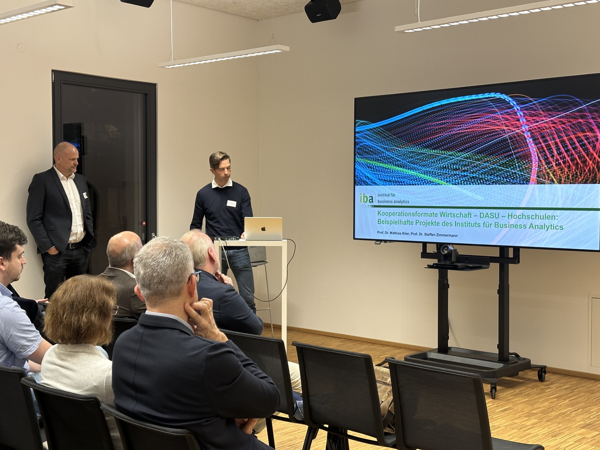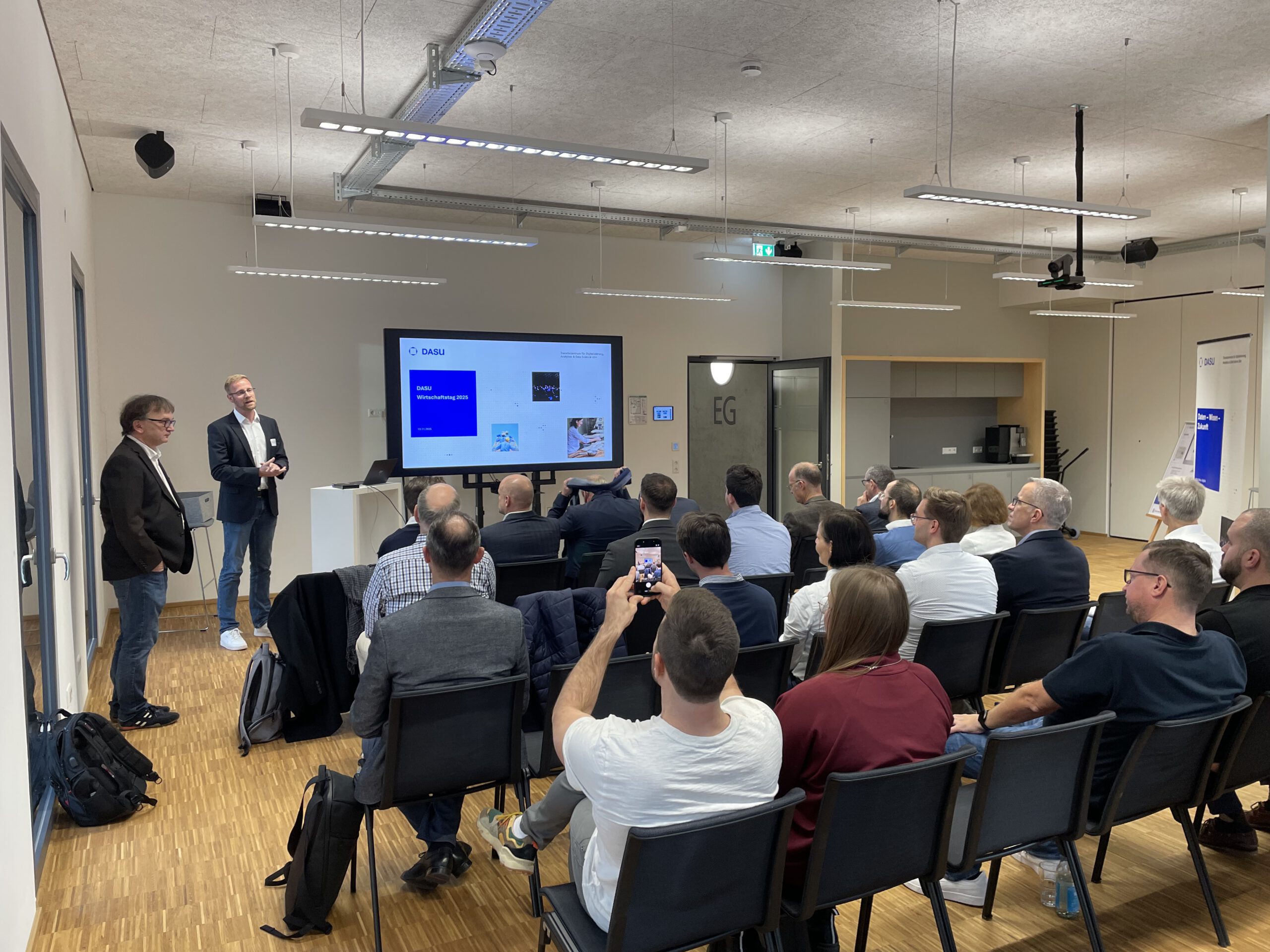 - Prof. Dr. Mathias Klier (Universität Ulm & Virtuelles Zentrum) & Prof. Dr. Steffen Zimmermann (Universität Ulm & DASU) stellten vergangene, aktuelle und kommende Kooperationsformate zwischen Wirtschaft, dem DASU und den Ulmer Hochschulen auf.