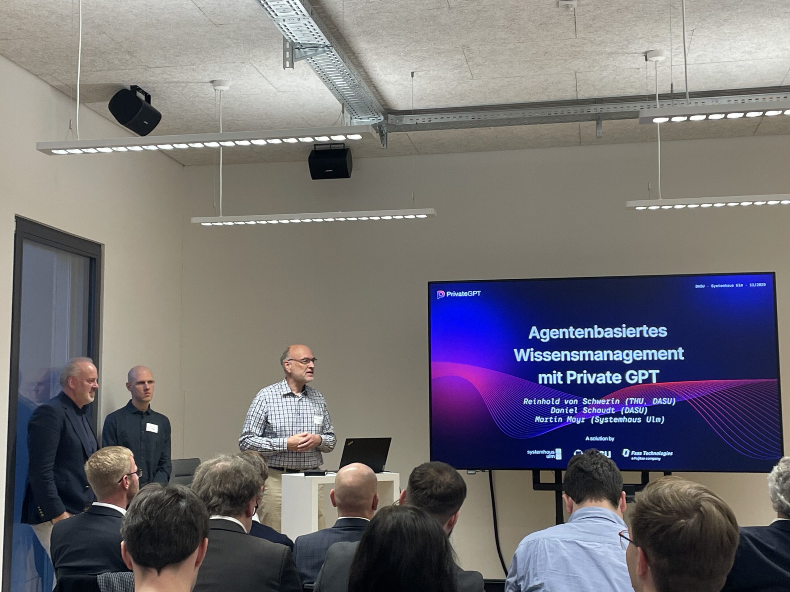 - Prof. Dr. Reinhold von Schwerin (Technische Hochschule Ulm & DASU), Martin Mayr (Systemhaus Ulm) & Dr. Daniel Schaudt (DASU) gaben Einblicke in neue Entwicklungen im Betrieb agentenbasierter ChatBots.