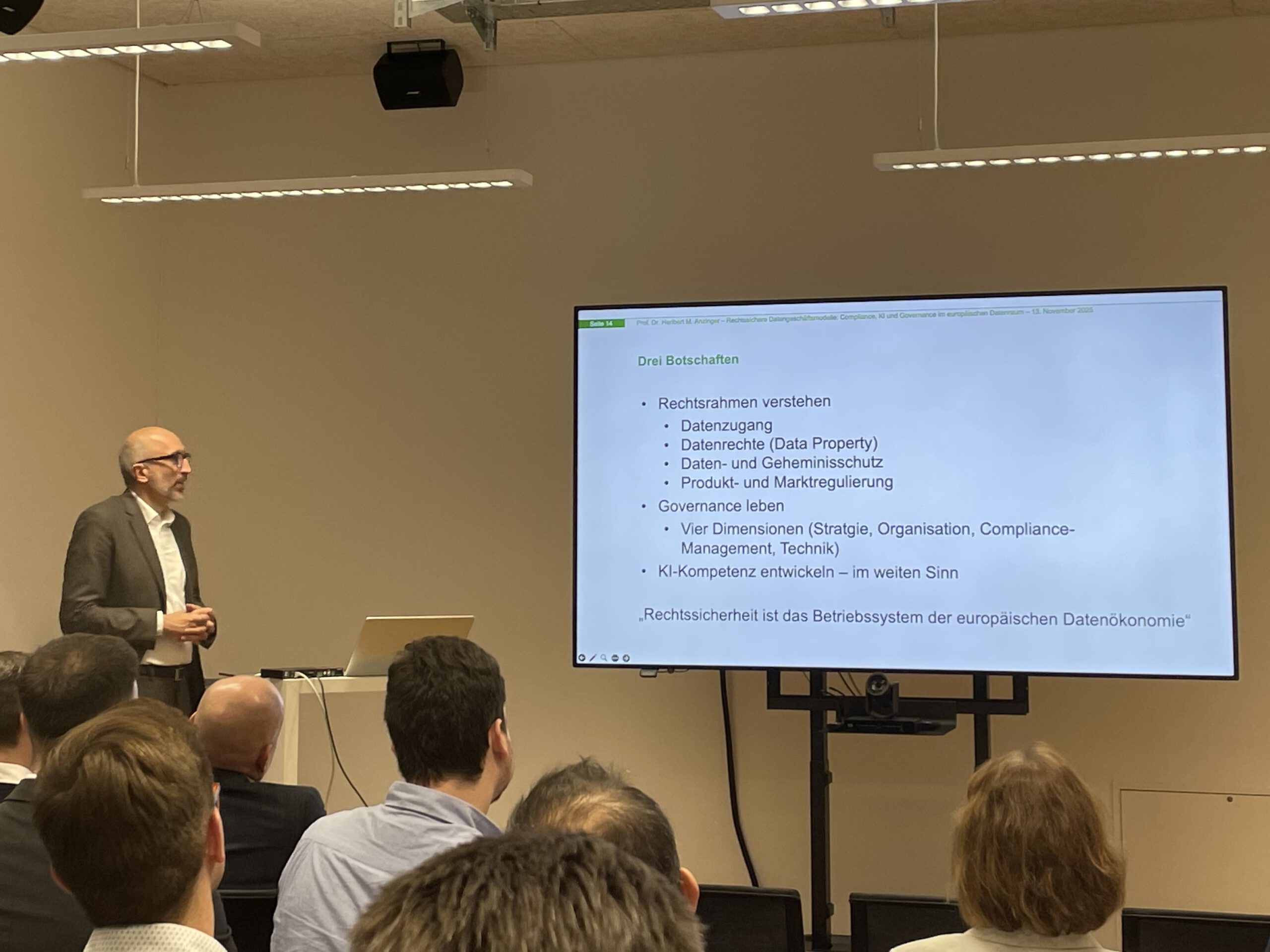 - Prof. Dr. Heribert Anzinger (Universität Ulm) beleuchtete die Rolle von Compliance, KI und Governance für rechtssichere Datengeschäftsmodelle im europäischen Raum .