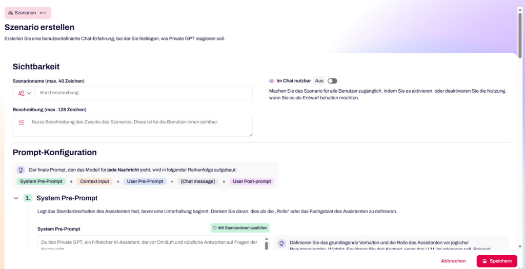 • Individuelle Szenarien: Konfigurierbare Workflows für Anwendungsfälle wie E-Mail-Entwurf, Dokumentzusammenfassung oder Code-Analyse